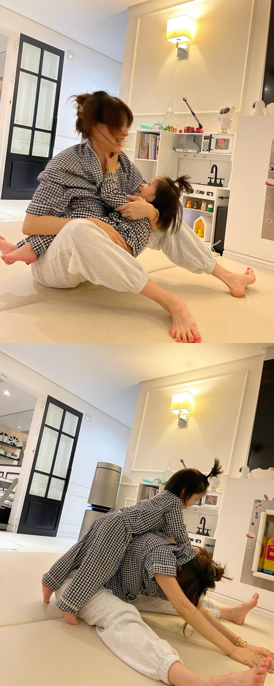 공개된 사진 속에는 커플 잠옷을 입은 양미라와 아들 서호 군의 모습이 담겨 있으며 서호 군은 양미라의 등에 매달리고 올라타며 환하게 웃고 있어 웃음을 안긴다.