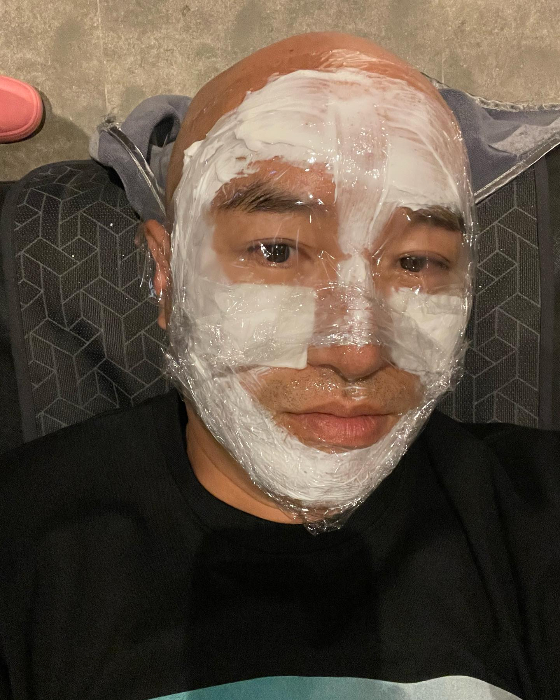 공개된 사진에는 랩으로 얼굴을 꽁꽁 감싸고 피부 관리를 받고 있는 모습이 담겼다. 관리 후 뽀얗게 된 모습은 한결 '미남 자태'를 드러내고 있다.