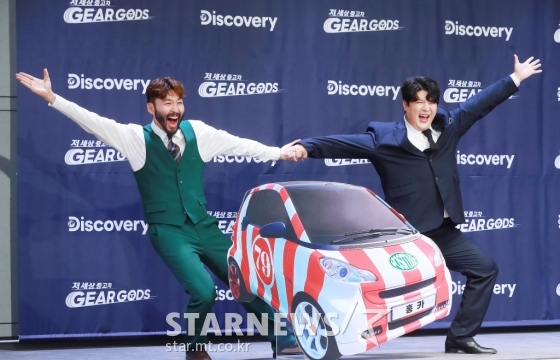 노홍철, 신동이 27일 오후 서울 중구 앰배서더 서울 풀만 호텔에서 진행된 디스커버리 새 예능 저 세상 중고차 - 기어갓(GEAR GODS) 제작발표회에 참석해 포즈를 취하고 있다.