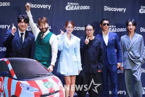 신동, 노홍철, 오정연, 하정석 PD, 박준형, 이특이 27일 오후 서울 중구 앰배서더 서울 풀만 호텔에서 진행된 디스커버리 새 예능 저 세상 중고차 - 기어갓(GEAR GODS) 제작발표회에 참석해 포즈를 취하고 있다.