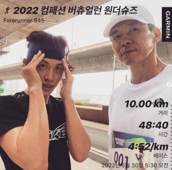 션은 31일 자신의 인스타그램에 "새벽 러닝 2022 컴패션 버츄얼런 원더슈즈. 임시완과 함께 10km 시완아~ 너무 잘 뛰는거 아니야? 시완이의 오랜만에 10km 48분 #UNKNOWNCREW #언노운크루"라는 글과 함께 사진을 게재했다.