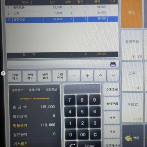 이 테이블의 손님들은 곱창모듬 2인분에 소주 네 병, 곱창전골 1인분까지 총 11만 9000원어치의 식사를 한 후 몰래 자리를 뜬 것으로 보인다.