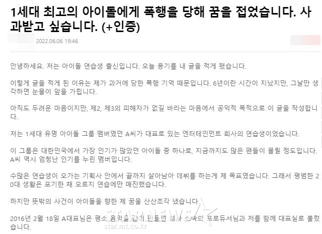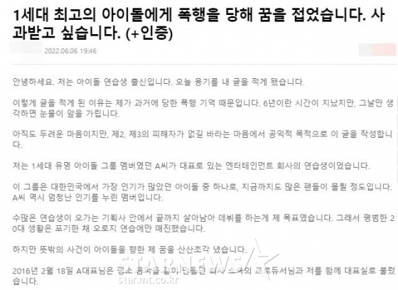 지난 6일 온라인 커뮤니티에는 '1세대 최고의 아이돌에게 폭행을 당해 꿈을 접었습니다. 사과받고 싶습니다'라는 제목으로 글이 올라왔다.
