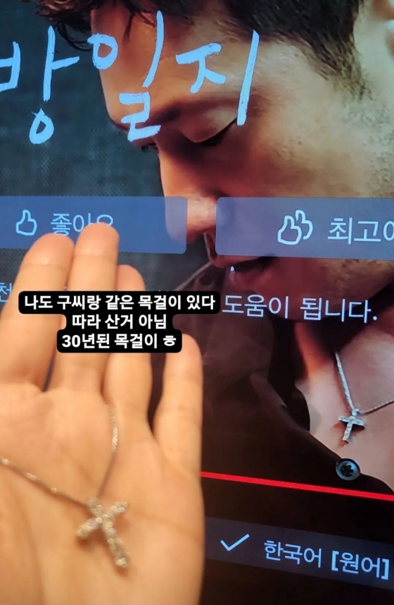 공개된 사진 속 화면에는 지난 달 종영한 JTBC 토일드라마 '나의 해방일지'에서 구씨 역을 맡은 손석구의 모습이 비춰져 있다. 그 앞 오연수의 손에 들린 십자가 목걸이는 화면 속 손석구가 착용한 목걸이와 같은 제품으로 눈길을 끌었다.