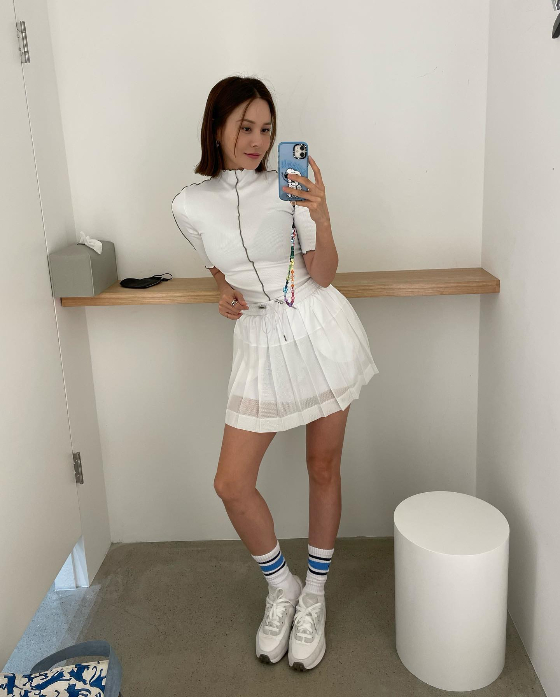 또 다른 사진에서는 화이트 스커트, 상의로 또 한번 명품 몸매를 드러내 팬들의 시선을 사로잡았다.