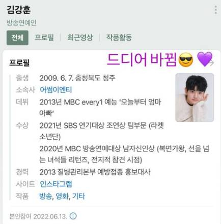 아역배우 김강훈이 10년 만에 포털사이트상 프로필 사진을 바꿨다.