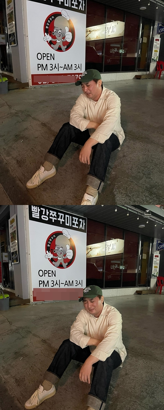 공개된 사진에는 바닥에 앉아 있는 황제성의 모습이 담겼다. 황제성은 울상으로, 통곡하는 듯한 분위기다. 이국주가 글을 통해 설명했듯이, 소개팅 때문에 나온 황제성의 반응이다.