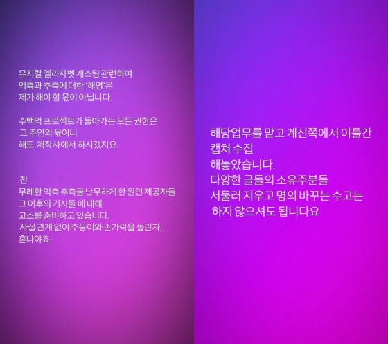 뮤지컬 엘리자벳 캐스팅 관련하여 억측과 추측에 대한 해명은 제가 해야 할 몫이 아닙니다.