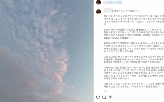 "뮤지컬의 핵심은 무대 위에서 펼치는 배우 간의 앙상블이기 때문에 동료 배우를 사랑하고, 존중해야 한다"는 1세대 뮤지컬 배우들의 뼈 때리는 조언은 옥주현에게만 해당되는 게 아니다. 김호영도 의도 여부를 떠나 이번 갈등을 일으킨 장본인 중 하나다. 아무리 SNS 게시물을 삭제했더라도 뱉은 말은 주워담을 수 없다. 책임을 져야 한다.