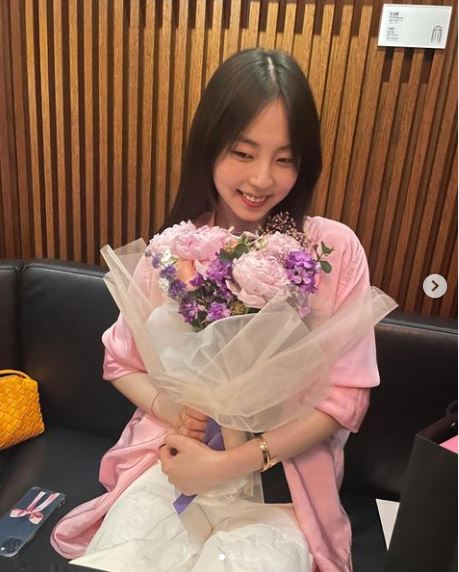 원더걸스 출신 배우 안소희가 생일을 기념해 핑크색 옷을 입고 꽃다발을 안으며 사진을 찍었다.