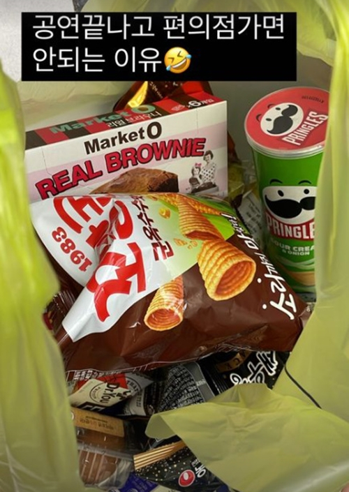 공개된 사진에는 비닐봉투에 과자가 한가득 담긴 모습이 담겼다. 공연 후 아이비가 편의점에서 산 과자로 보인다. 과자 폭식을 예고하는 듯한 모습.