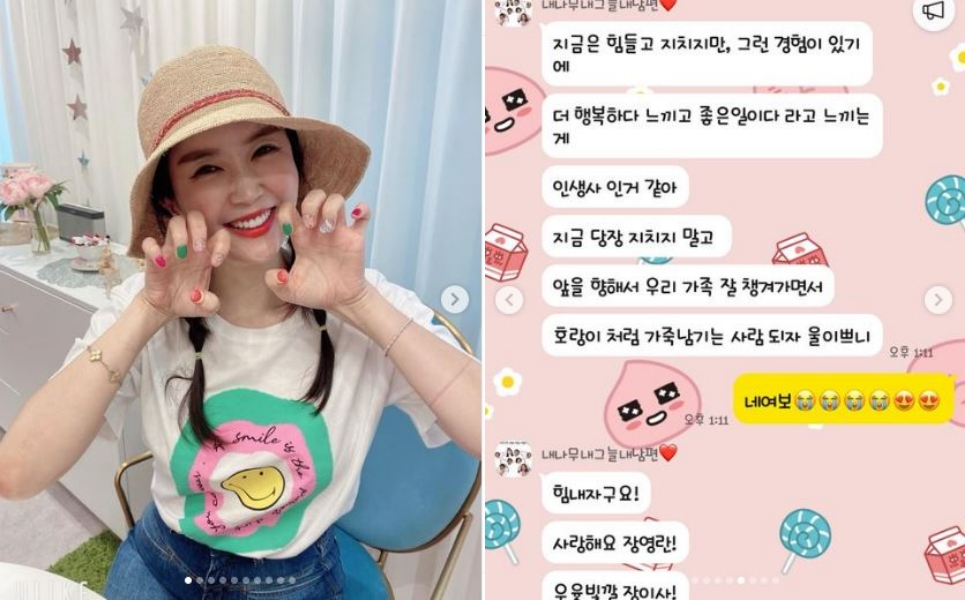 게재된 사진에는 장영란이 다양한 색상의 네일아트를 하고 활짝 웃는 모습이 담겼다. 장영란은 여름과 어울리는 밀짚모자를 쓰고 흰색 셔츠를 입었다. 셔츠에는 스마일 캐릭터가 그려져 밝은 이미지를 한껏 풍겼다. 장영란이 게재한 또 다른 사진에는 남편과 주고받은 카톡 내용을 공개하며 여전히 달달한 분위기를 자랑했다.