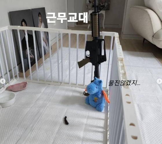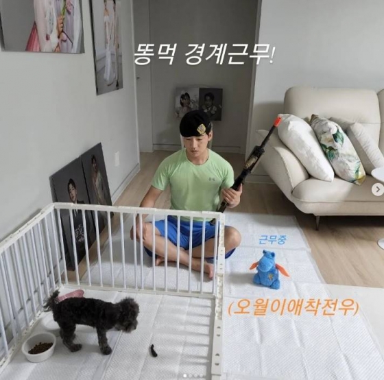 박군은 5일 자신의 인스타그램에 "우리 오월이가 자꾸 똥을 잡숴요... 것두 겁내 맛있게... 가정 평화 유지 중! 어제 밤 교훈: 오늘의 아군이 내일의 적이 된다! 오월이: 드래곤 두고보자... 어제 밤 초소 브리핑~ 똥접근경계근무"라는 글과 함께 사진을 올렸다.