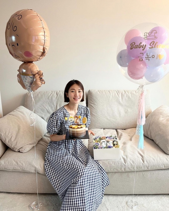 공개된 사진 속에는 임신 축하를 받고 있는 박승희의 모습이 담겨있다. 케이크를 들고 있는 박승희의 환한 미소가 시선을 사로잡는다.