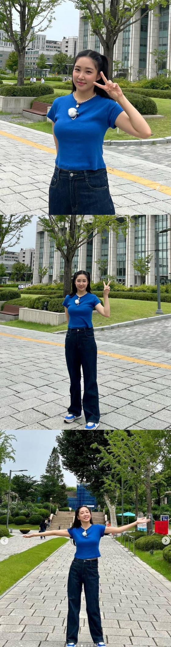 공개된 사진 속 최희는 파란 크롭 티셔츠에 청바지를 입고 양갈래 반묶음 머리를 한 후 모교인 연세대학교 캠퍼스를 간 모습이다.