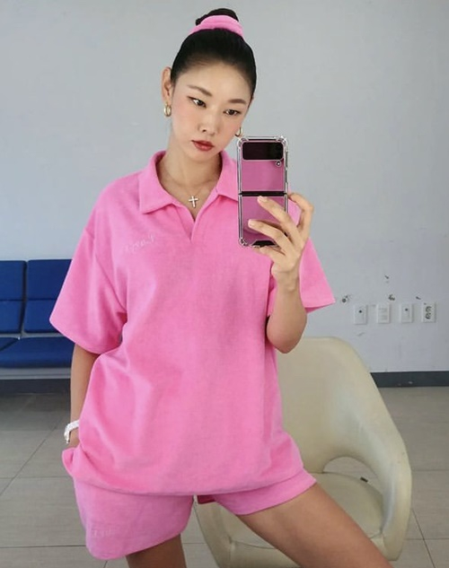 16일 모델 겸 방송인 한혜진은 자신의 인스타그램 계정을 통해 리본 이모티콘과 함께 한 장의 사진을 게재했다. 사진 속 한혜진은 머리띠부터 상의, 하의까지 쨍한 핫핑크 셋업으로 맞춰 입고 거울 셀카를 찍었다.