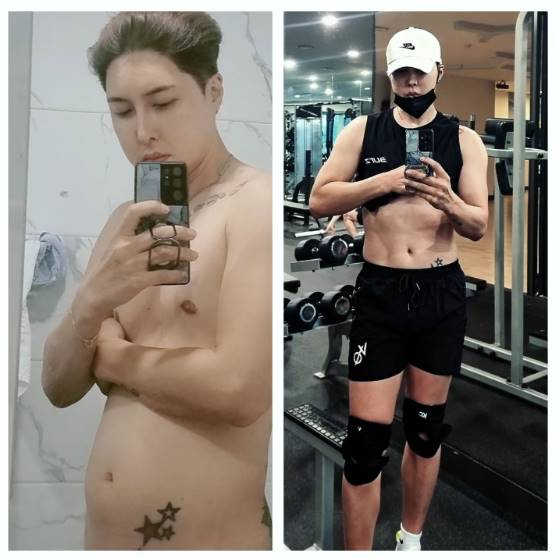 사진 속에는 김기수의 운동 전 후 몸매 차이가 보인다. 운동 전 배가 나왔던 그는 운동 후 복근이 생긴 모습을 선보였다.