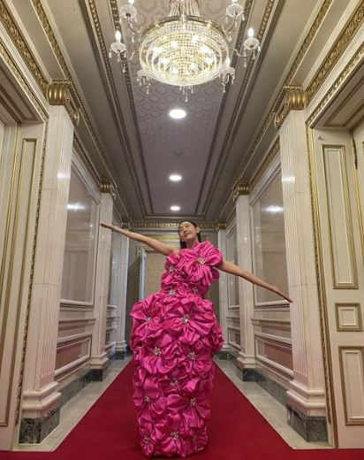 공개된 사진에는 한혜진이 핑크색 드레스를 입고 긴 팔을 쭉 뻗고 있는 모습이 담겼다. 한혜진은 궁전을 연상케 하는 화려한 건물 안에서 레드 카펫 밟고 핑크색 꽃으로 감싼듯한 드레스를 완벽하게 소화해냈다.