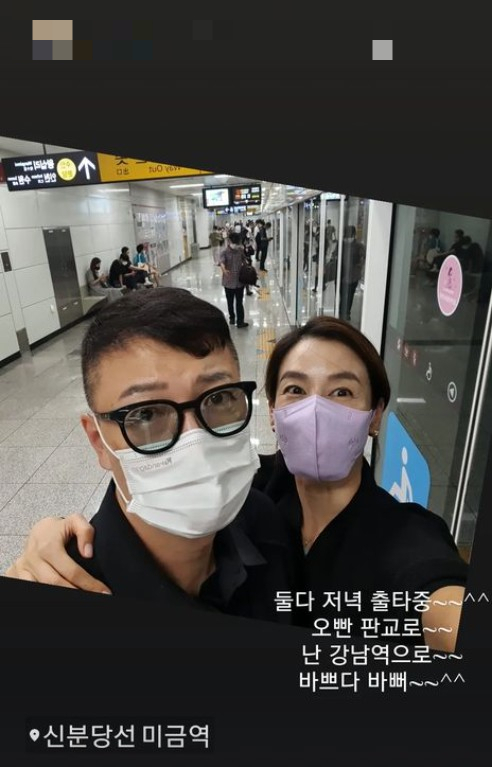 김지호는 19일 자신의 인스타그램 스토리를 통해 "둘 다 저녁 출타 중, 오빤 판교로, 난 강남역으로, 바쁘다 바빠"라는 문구를 삽입한 한 장의 사진을 공개했다.