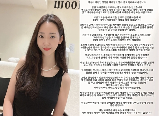 정숙은 25일 자신의 인스타그램에 "사실이 아닌 건 정정 해야할 것 같아 글을 올린다.가야금 체험의 취지는 홍보 목적이 없었다. 국악을 알리고 싶었던 마음이 커 기획을 하게 됐다"고 가야금 체험의 취지를 설명했다.