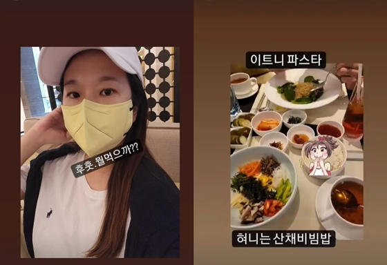 홍현희는 26일 자신의 인스타그램 스토리에 "후훗. 뭘 먹으까??"라는 글이 적힌 사진을 게재했다. 또한 "이트니(제이쓴) 파스타. 혀니(홍현희)는 산채비빔밥"이라는 글이 담긴 사진도 게재했다.