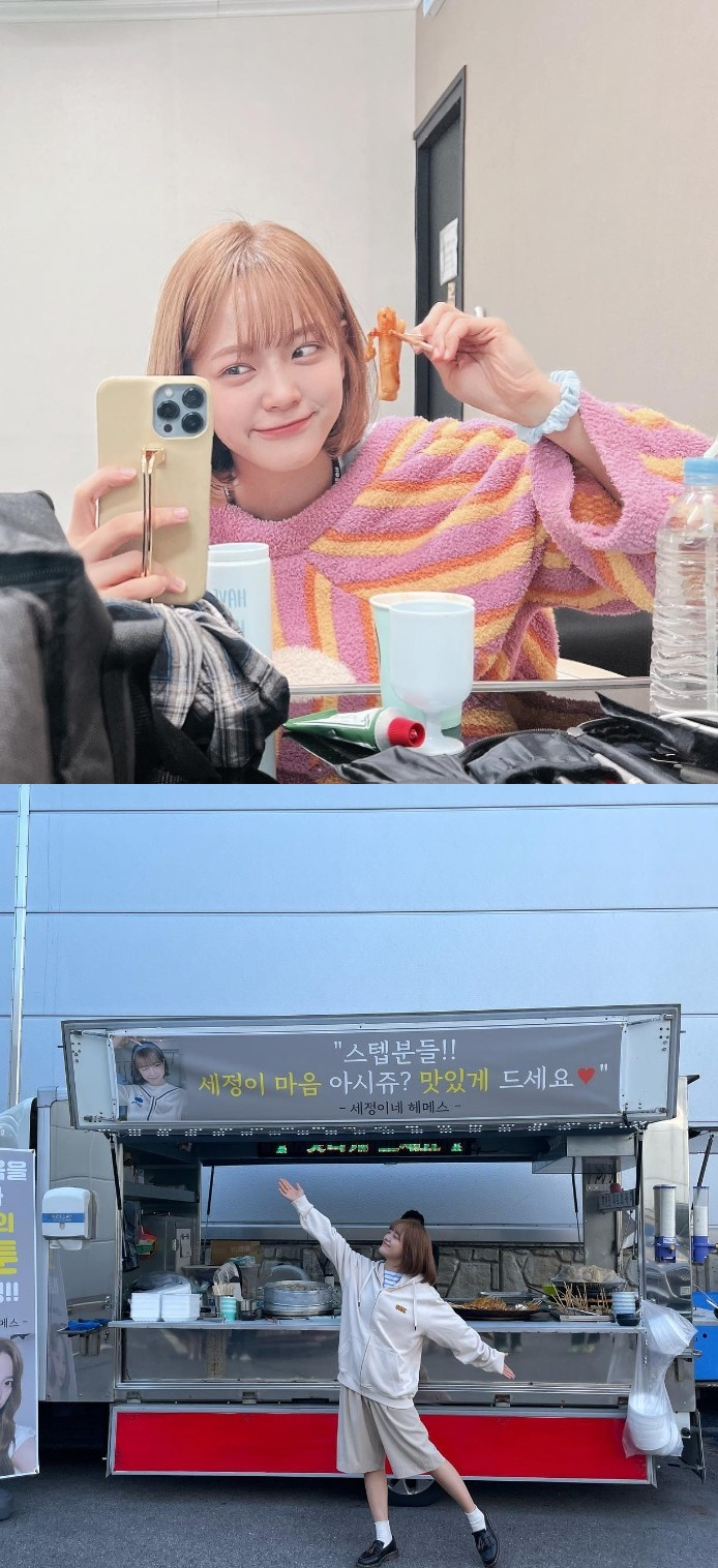 걸그룹 아이오아이의 멤버이자 배우 김세정이 분식차 응원을 받은 사진을 공개했다.