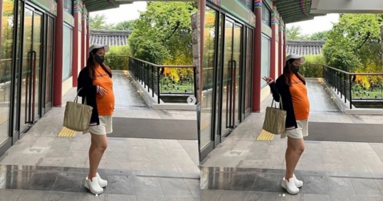 공개된 사진에는 홍현희가 주황색 티셔츠와 흰색 반바지를 입고 캡 모자를 쓰고 있다. 홍현희는 만삭인 배를 내밀며 힘겹게 브이(V)를 했다.