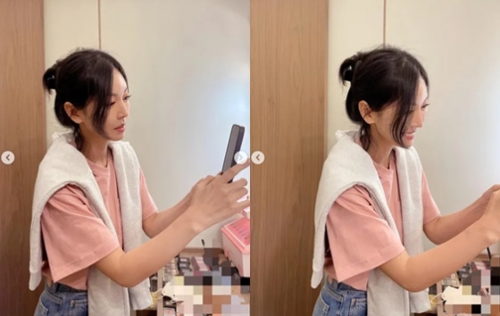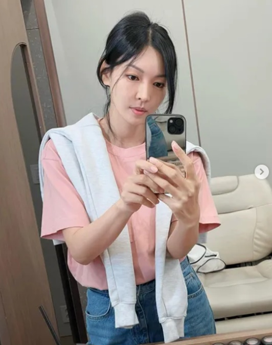 사진 속 김소연은 거울을 향해 셀카를 찍는 모습. 핑크색 티셔츠에 청바지를 입은 김소연은 어깨에 맨투맨을 걸친고 머리를 가볍게 묶어 올렸다.