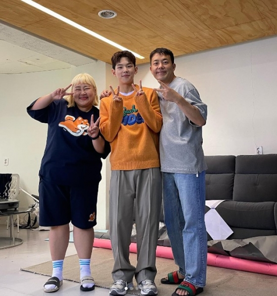공개된 사진 속에는 폴킴이 코미디언 부부 홍윤화, 김민기 사이에서 오렌지색 니트를 입고 손으로 '브이'자 모양을 한 모습이 담겼다. 오렌지 색 니트를 찰떡 소화하며 상큼한 이미지를 뽐내 시선을 끌었다.