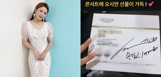 송가인은 6일 자신의 인스타그램 스토리에 "콘서트에 오시면 선물이 가득! ♥"이라는 글이 담긴 사진을 게재했다.