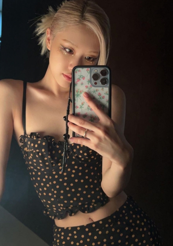 사진에서 로제는 크롭탑과 치마를 입고 가녀린 몸매를 자랑했다.