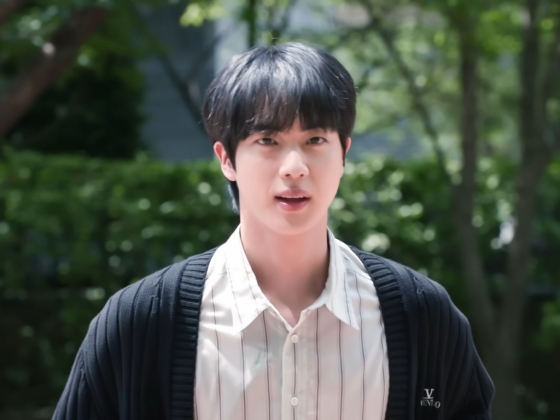 단정한 헤어스타일을 하고 세로 줄무늬 티셔츠와 넓은 어깨가 돋보이는 검정색 가디건을 입은 진은 대학생 같은 풋풋함과 생기 발랄한 외모로 보는 이들의 가슴을 설레게 했다.