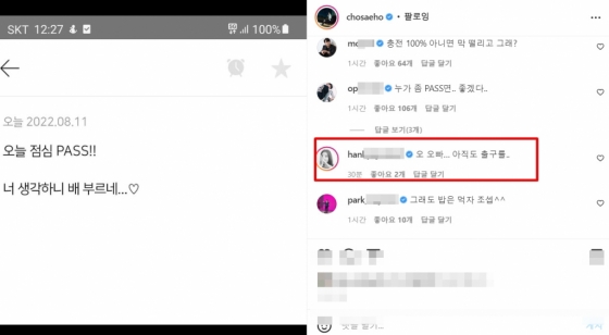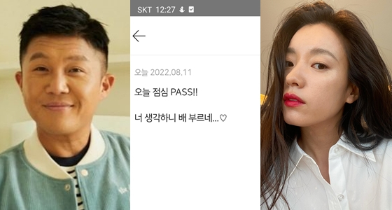 공개된 사진에는 "오늘 점심 PASS!! 너 생각하니 배 부르네...♡"라는 글이 담겼다.