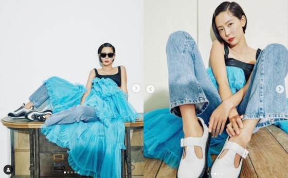 공개된 사진에는 김나영이 검은색 스퀘어 넥 민소매티셔츠를 입고 선글라스를 착용해 도도한 매력을 자아냈다. 김나영은 캐주얼한 패션에 화려한 하늘색 치마를 둘러 독특한 패션을 완성시켰다. 또 다른 사진에는 김나영이 벽에 기대 흰색 단화를 신고 시크한 표정을 지었다.