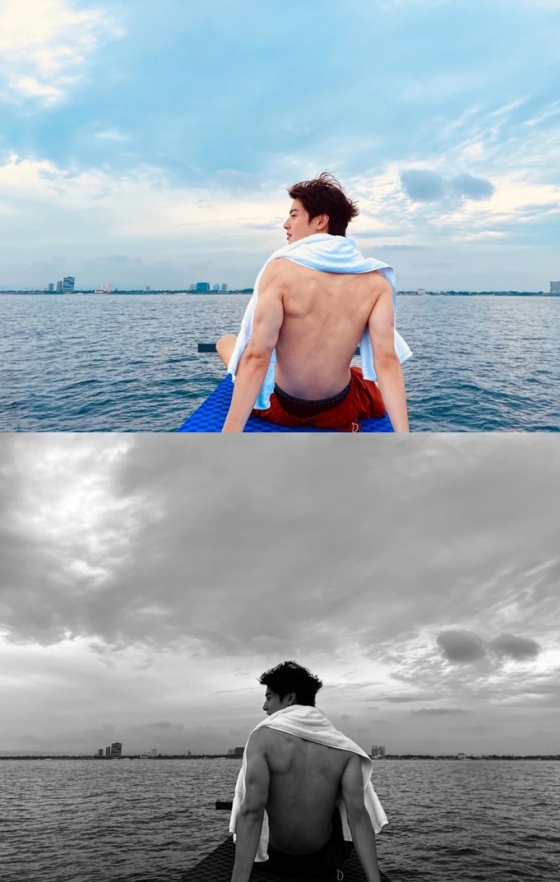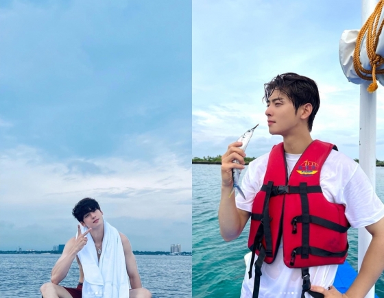공개된 사진에는 상의를 탈의한 채 물놀이를 즐기는 차은우의 모습이 담겨 있다. 사진 속 차은우는 떡 벌어진 어깨와 넓은 등을 드러낸 채 여유로운 시간을 보내고 있다. 특히 '얼굴 천재'라는 수식어에 걸맞은 훈훈한 외모와 함께 군살 없이 울퉁불퉁 튀어나온 등과 팔 근육이 시선을 끌었다.