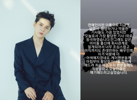 이어 "안 그래도 같은 아이돌 출신에 회사 관계로 알게 돼서 너무 조심스럽고 아직까지도 존대만 하는 배우인데 이거 덕분에 더 어색해질 것 같다"며 "케이 팬분들께 아침부터 황당한 기사를 접하게 해드려 죄송하고, 우리 팬분들께도 걱정 말라고 오늘만큼은 얘기해 드리고 싶었다"고 말했다.
