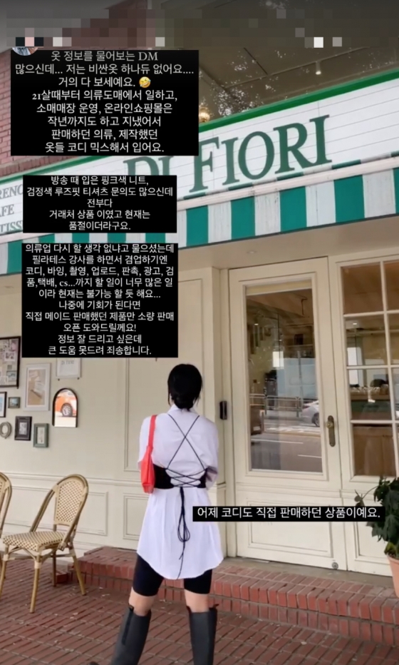 전다빈은 "21살 때부터 의류도매에서 일하고 소매매장 운영, 온라인쇼핑몰은 작년까지도 하고 지냈어서 판매하던 의류, 제작했던 옷들 코디 믹스해서 입어요"라며 "방송 때 입은 핑크색 니트, 검정색 루즈핏 티셔츠 문의도 많으신데 전부다 거래처 상품이었고 현재는 품절이더라고요"라고 덧붙였다.