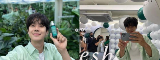 공개된 사진에는 최우식이 홍보 제품을 들고 미소 지으며 귀여운 매력을 발산했다. 최우식은 흰색 티셔츠에 연두색 셔츠를 입고 여전히 동안 외모로 시선을 끌었다.