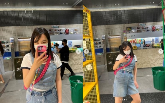 공개된 사진에는 이은지가 데님 스타일의 옷을 입고 미소 짓고 있는 모습이 담겼다. 이은지는 팽크색 가방를 메고 핑크색 케이스를 씌운 휴대폰으로 사진을 찍으며 즐거워했다.