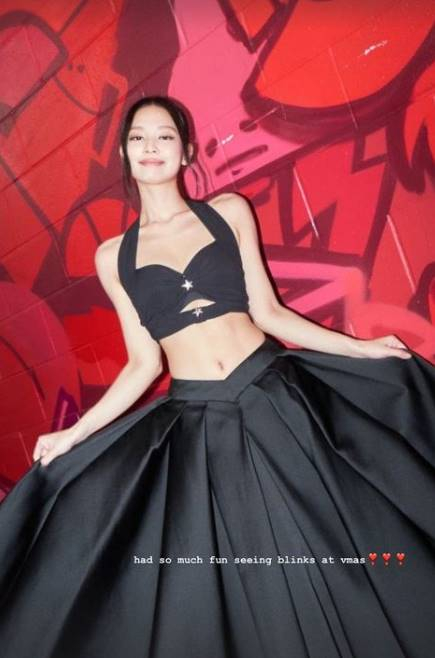 그는 허리를 드러낸 블랙 드레스를 입고 흐뭇하게 웃음지었다. 제니는 "had so much fun seeing blinks at vmas♥♥♥"라고 덧붙였다.