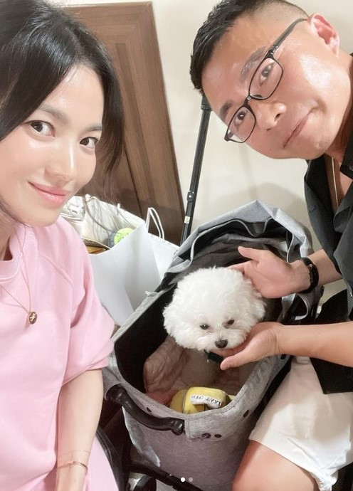 사진에는 주형선과 송혜교가 애완견과 함께 일상을 보내며 함께 찐친 우정을 인증하는 셀카 포즈를 취하고 있다.