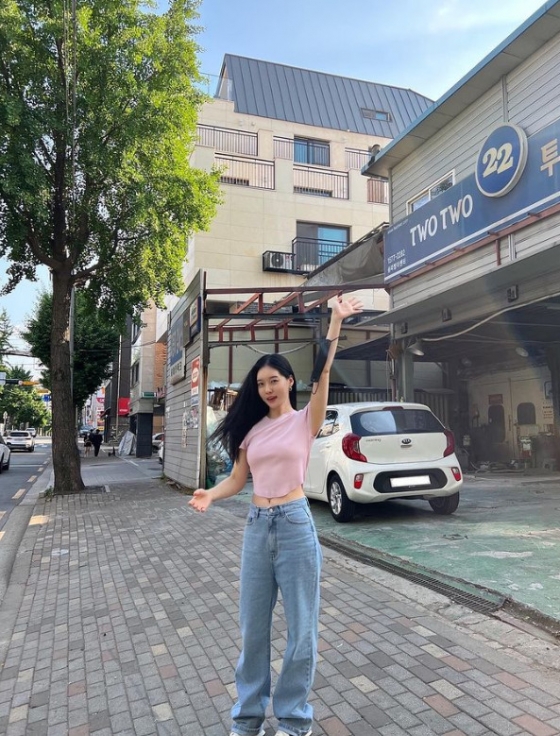 사진 속엔 김유지가 밝은 미소를 지으며 손을 올리고 있다. 분홍색 상의와 청바지를 입고 포즈를 취한 그는 완벽한 비율을 자랑한다.