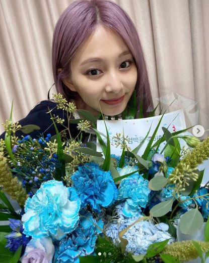 공개된 사진에는 보라색 헤어스타일을 한 쯔위가 파란색 꽃다발을 들고 귀여운 미소를 짓고 있는 모습이 담겼다. 꽃다발에는 '트와이스 컴백을 축하합니다'라는 문구가 적혀있다.
