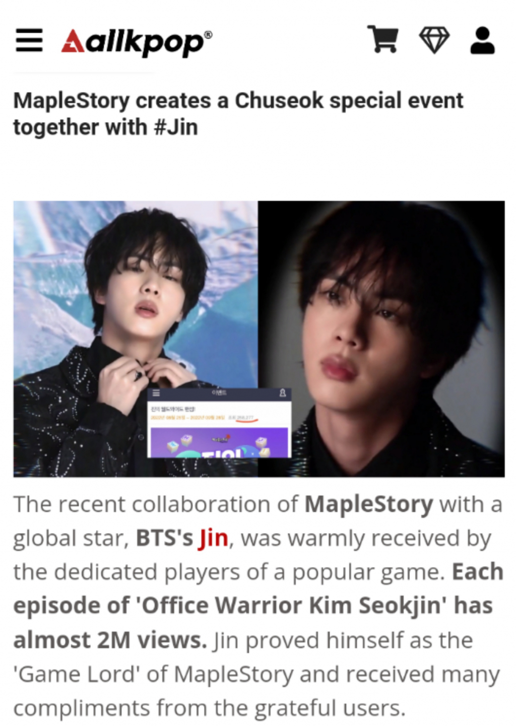 북미 매체 올케이팝(allkpop)은 최근 '진과 함께 특별 이벤트를 연 메이플스토리'라는 제목의 기사에서 글로벌 스타 진과 메이플스토리와의 협업은 오랜 유저들로부터 뜨거운 호응을 얻었다고 전했다.