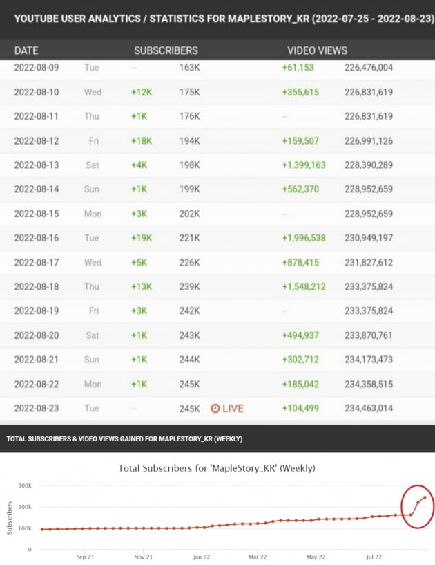 7월 한달 동안 메이플스토리 채널에 추가된 하루 평균 구독자수는 193명, 진과 협업 이후에는 5857명으로, 일평균 구독자수가 30배 이상 증가하며 진의 막강한 파급력을 입증했다.