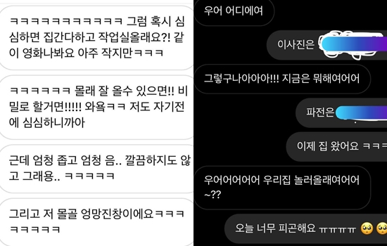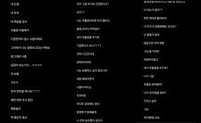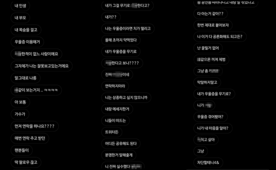 DM 공개 이후 B씨는 다른 팬들로 제보받은 A씨의 DM을 공유했다. A씨는 다른 팬들에게 "우리집 놀러 올래요?" "너무 외로워서 그래요" "방 잡아놓으면 술 사오실래요?" 등의 메시지를 보냈다.