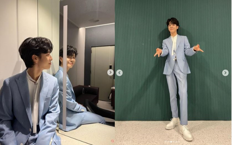 공개된 사진에는 정동원이 하늘색 무대의상을 입고 거울을 보며 웃고 있는 모습이 담겼다. 또 다른 사진에는 정동원이 거꾸로 브이를 하는 이른바 '갸루피스' 전신샷도 공개됐다. 정동원은 여전히 훈훈한 외모로 미소년 분위기를 자아냈다.