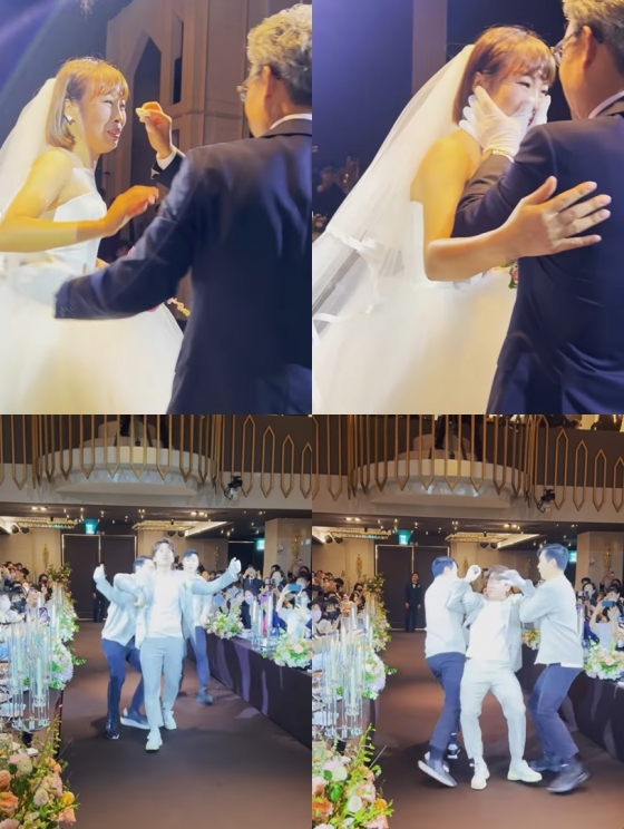 공개된 영상에는 오나미의 결혼식장을 찾은 김영철의 모습이 담겨 있다. 김영철은 오나미를 향해 "결혼 하지 마"라며 오나미의 유행어를 활용한 센스 있는 인사로 웃음을 주고 있다. 오나미도 "해야 돼"라며 자신의 유행어로 화답했다.