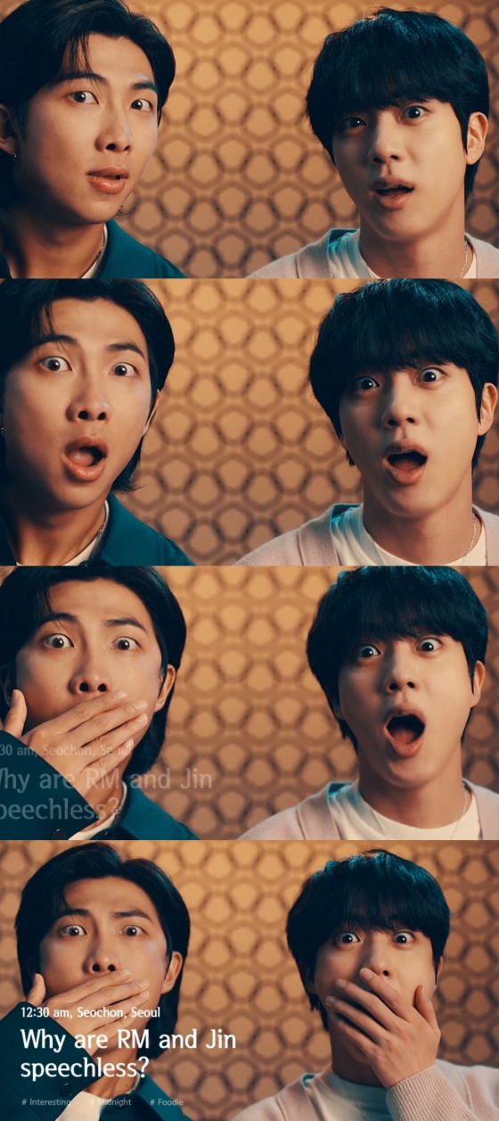 진은 공개된 첫 번째 에피소드 '미식의 밤'(deliciouSeoul) 편에서 'AM 12:30 서촌에서 'RM과 진이 깜짝 놀란 이유는?'이란 문구와 함께 조각 미남의 정석을 보여주며 눈길을 사로잡았다.