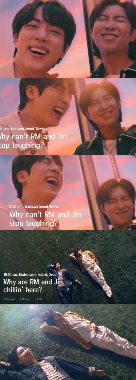 'AM 10:00 서울 한강 노들섬에서 RM과 진은 왜 누워있을까?'라는 문구의 짧은 티저 영상은 새소리가 들리는 푸른 잔디 위 차분한 음악을 배경으로 부드러운 미소를 머금은 채 누워있는 진의 모습이 편안한 힐링을 선사했다.